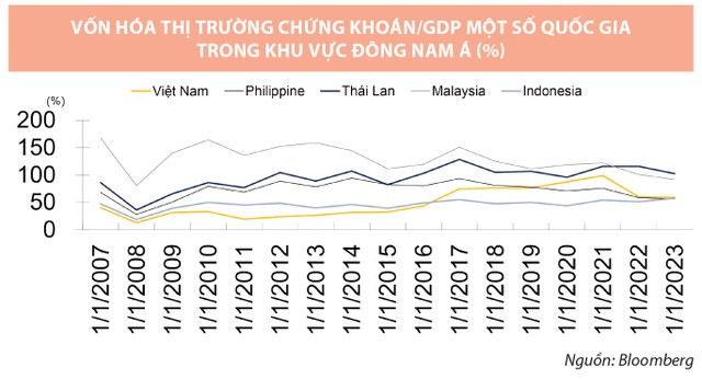 Trong khi đó, theo số liệu của Bộ Tài chính, tổng vốn hóa thị trường cổ phiếu niêm yết tính đến ngày 28/6/2024 đạt 7,06 triệu tỷ đồng, tăng 19% so với cuối năm 2023; tương đương 69,1% GDP ước tính năm 2023. Mặc dù con số này vẫn thấp hơn một số thị trường trong khu vực, nhưng tăng mạnh so với mức 20 - 30% cách đây một thập kỷ, thể hiện thị trường từng bước lớn mạnh, khẳng định vai trò trong hệ thống tài chính Việt Nam.