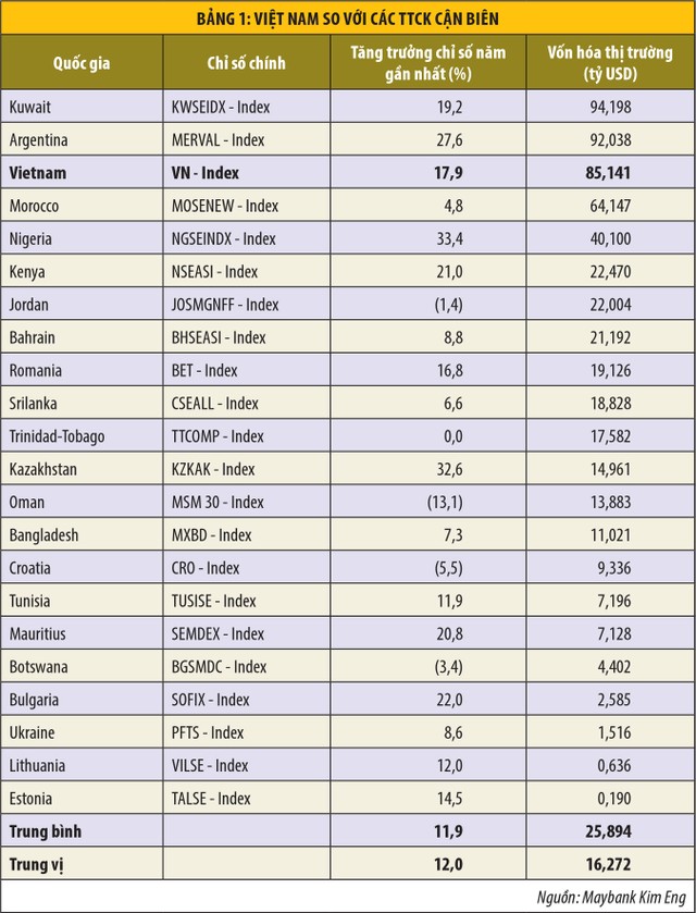 Theo tính toán của Maybank Kim Eng, quy mô TTCK cơ sở Việt Nam nếu tính trên 2 sàn niêm yết HOSE và HNX hiện đạt trên 85,1 tỷ USD, con số này không kém thị trường Argentina bao nhiêu (92 tỷ USD) và lớn hơn nhiều so với các thị trường cùng loại “cận biên” như Morocco (64 tỷ USD), Nigeria (40 tỷ USD), Srilanka (18,8 tỷ USD)…