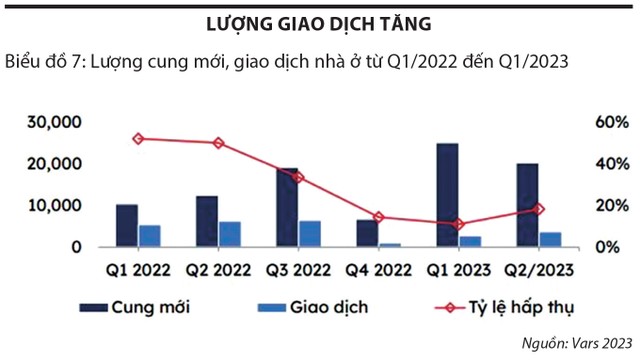 Theo dữ liệu của Hội Môi giới bất động sản Việt Nam (VARS) công bố mới đây, nếu như quý I/2023 chỉ có hơn 1.000 sản phẩm được giao dịch trên toàn quốc thì sang quý II/2023 tăng lên khoảng 3.700 giao dịch thành công và tới quý III/2023, lượng tiêu thụ đạt khoảng 5.770 giao dịch, chiếm xấp xỉ 28% tổng cung mở bán mới và gần bằng 90% so với cùng kỳ năm 2022.