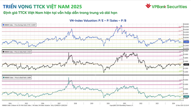 Về thanh khoản, giá trị giao dịch trung bình trong năm 2024 đạt 21.300 tỷ đồng, tăng 22% so với năm trước, tuy nhiên phân bố không đều với mức thanh khoản cao trong nửa đầu năm và sụt giảm về giữa và cuối năm do bị ảnh hưởng bởi tỷ giá, áp lực bán ròng. Giai đoạn cuối 2024 - nửa đầu 2025, thanh khoản có thể đi ngang trên nền trung bình và thấp; tuy nhiên, trong nửa cuối năm 2025, kể từ tháng 8, thanh khoản sẽ tăng cao, được kích hoạt nhờ nâng hạng khi dòng tiền trong nước và khối ngoại gia tăng mua trở lại.
