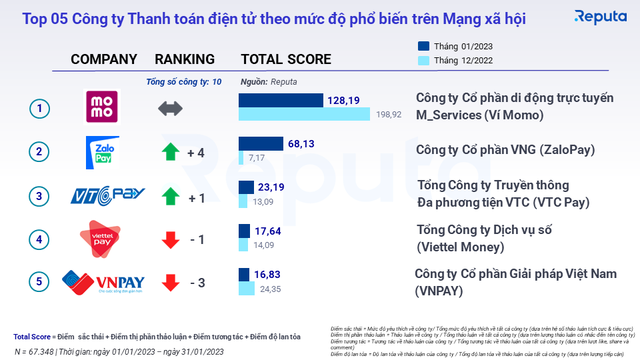 Tuy có sự giảm nhẹ 1,5 lần so với tháng 12/2022, MoMo vẫn giữ vững ngôi vị đầu bảng xếp hạng với Total Score tổng điểm đạt 128,19. Trong tháng 1, MoMo nhận về 2.357.607 tổng tương tác từ các bài viết trên nền tảng Facebook. Trong đó, bài viết minigame “Sáng tạo mã QR-Mê say rước lộc về nhà liền”, được người dùng hưởng ứng nhiệt tình nhận về hơn 13.390 tương tác.