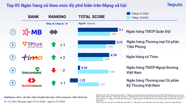 Nhìn chung, top 5 Bảng xếp hạng tháng 02/2023 lượng thảo luận đang có chiều hướng tăng lên. TP Bank vượt lên top 2, tăng 32%, đạt 5,72 điểm Total Score thông qua các bài viết nổi bật.