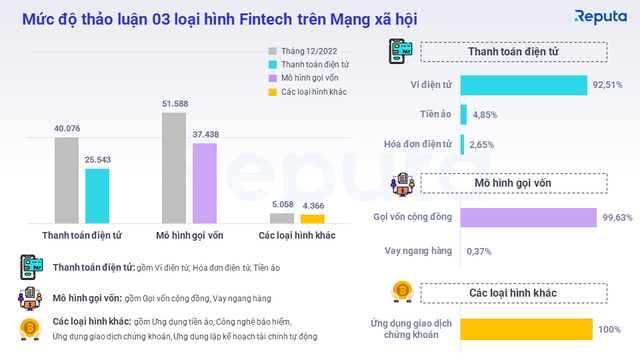 Về lượng thảo luận của 3 loại hình Fintech, lượng thảo luận của 3 loại hình đều giảm đi so với tháng trước. Cụ thể, “Thanh toán điện tử” ghi nhận giảm 36,26%, “Mô hình gọi vốn” giảm 27,42% và các loại hình khác giảm 13,6% đến từ người dùng Mạng xã hội.