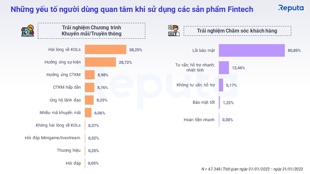 Trong các yếu tố người dùng quan tâm khi sử dụng, người dùng các sản phẩm Fintech thường quan tâm nhiều đến các hoạt động quảng bá từ KOLs và các sự kiện, chiếm hơn 66% lượng quan tâm. Trong khi đó, lỗi bảo mật là yếu tố mà người dùng quan tâm trong trải nghiệm Chăm sóc khách hàng, chiếm 80,85% lượng thảo luận.