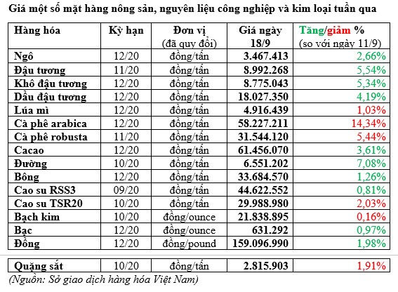 Ngược lại, giá cà phê arabica giảm suốt 5 phiên của tuần qua do các quỹ hàng hóa bán mạnh sau khi dự báo sẽ có mưa ở Brazil, điều kiện giúp cây cà phê sinh trưởng tốt. Kết thúc phiên giao dịch cuối tuần, cà phê arabica kỳ hạn tháng 12/2020 giảm 4,5 US cent (3,8%) xuống 1,135 USD/lb, mức thấp nhất trong 1,5 tháng qua.