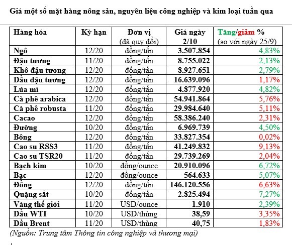 Sau tuần giảm mạnh trước đó, giá các mặt hàng nông sản đã hồi phục trở lại trong tuần này. Kết thúc phiên 2/10, giá ngô kỳ hạn tháng 12/2020 trên sàn Chicago giảm 0,5% xuống 3,8-3/4 USD/bushel, đóng cửa phiên trước đó tăng 1% lên 3,85-1/2 USD/bushel - mức cao nhất kể từ ngày 3/3/2020. Tính chung từ 25/9-2/10, giá ngô tăng 4,83% - tuần tăng mạnh nhất kể từ ngày 28/8/2020.