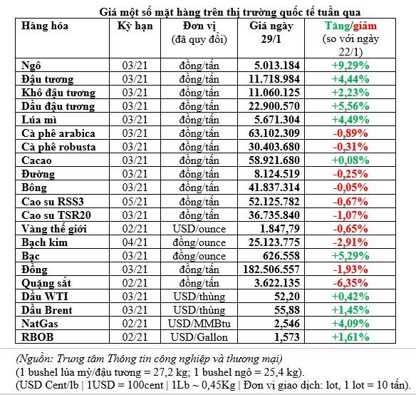 Trên sàn Chicago, giá ngô kỳ hạn tháng 3/2021 tăng 1/2 US cent lên 5,34-1/2 USD/bushel, trong phiên có lúc đạt 5,5-1/2 USD/bushel - cao nhất kể từ tháng 6/2013.