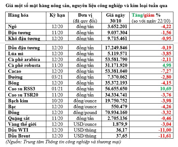 Với cà phê, giá arabica kỳ hạn tháng 12/2020 trên sàn New York phiên giao dịch cuối tháng 10/2020 giảm 0,4 cent, tương đương giảm 0,38%, xuống mức 104,6 US cent/lb; trong phiên có lúc chạm mức thấp nhất ở 102,95 US cent/lb. Như vậy, arabica đã giảm 6,35 cent so với mức 110,95 US cent/lb chốt hồi đầu tháng, tươn đương giảm 5,7% trong tháng 10, riêng tuần cuối giảm hơn 2%.