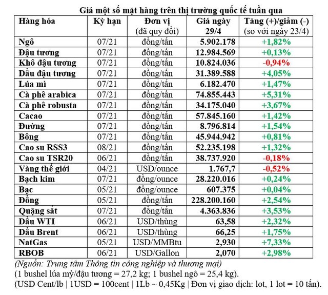 Phiên giao dịch cuối tháng 4/2021, giá các loại ngũ cốc đều tăng, dẫn đầu là mặt hàng ngô. Theo đó, giá ngô giao tháng 7/2021 tăng 25 US cent Mỹ (+3,86%) lên 6,7325 USD/bushel, chủ yếu do các dự báo về tình hình thời tiết khô hạn, có thể làm ảnh hưởng đến nguồn cung.