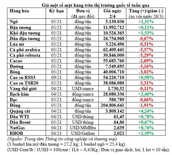 Giá đường thô kỳ hạn tháng 5/2021 đóng cửa phiên cuối tuần qua giảm 0,06 US cent (-0,4%) xuống 14,71 US cent/lb sau khi xuống mức thấp nhất 3 tháng tại 14,67 US cent trong ngày 31/3. Đường trắng cùng kỳ hạn tăng 3,4 USD hay 0,8% lên 423,4 USD/tấn.