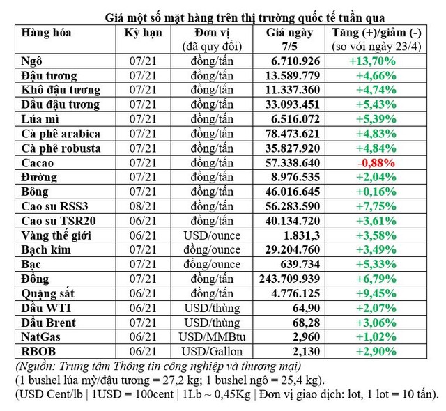 Phiên cuối tuần 7/5, giá ngô Mỹ giao dịch trên sàn Chicago có thời điểm đạt 7,35-1/4 USD/bushel, cao nhất kể từ tháng 3/2013, trước khi kết thúc ở mức 7,32-1/4 USD/bushel, tăng 13-1/2 US cent so với phiên 6/5, tính cả tuần giá tăng tới 13,7%.