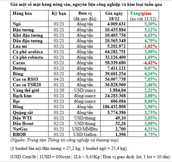 Cu thể, trên thị trường Chicago, giá đậu tương kỳ hạn tháng 1/2021 tăng 18-3/4 US cent lên 12,2 USD/bushel, trong phiên có lúc đạt 12,24-3/4 USD/bushel - cao nhất kể từ ngày 30/6/2014. Tương tự, giá ngô kỳ hạn tháng 3/2021 tăng 5 US cent lên 4,37-1/2 USD/bushel. Tính cả tuần, 2 mặt hàng này đều tăng hơn 5%.