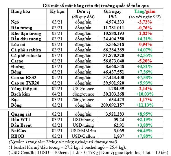 Ở nhóm kim loại công nghiệp, giá đồng tăng lên mức cao nhất 9 năm khi đóng cửa phiên 19/2, cũng là phiên tăng thứ 3 liên tiếp do nguồn cung bị thắt chặt và tác động từ xu hướng giá kim loại cơ bản nhìn chung đều tăng sau Tết Nguyên đán 2021.