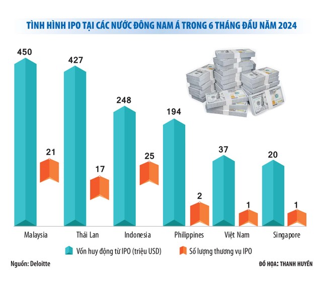 Theo báo cáo của Deloitte phát hành đầu tháng 7/2024, số lượng doanh nghiệp lên sàn chứng khoán ở Đông Nam Á trong nửa đầu năm 2024 , giảm 21,2% so với cùng kỳ năm ngoái, chỉ có 67 doanh nghiệp. Tổng vốn hóa thị trường của các công ty này khi tiến hành IPO đạt 5,8 tỷ USD, giảm 71% so với cách đây một năm.