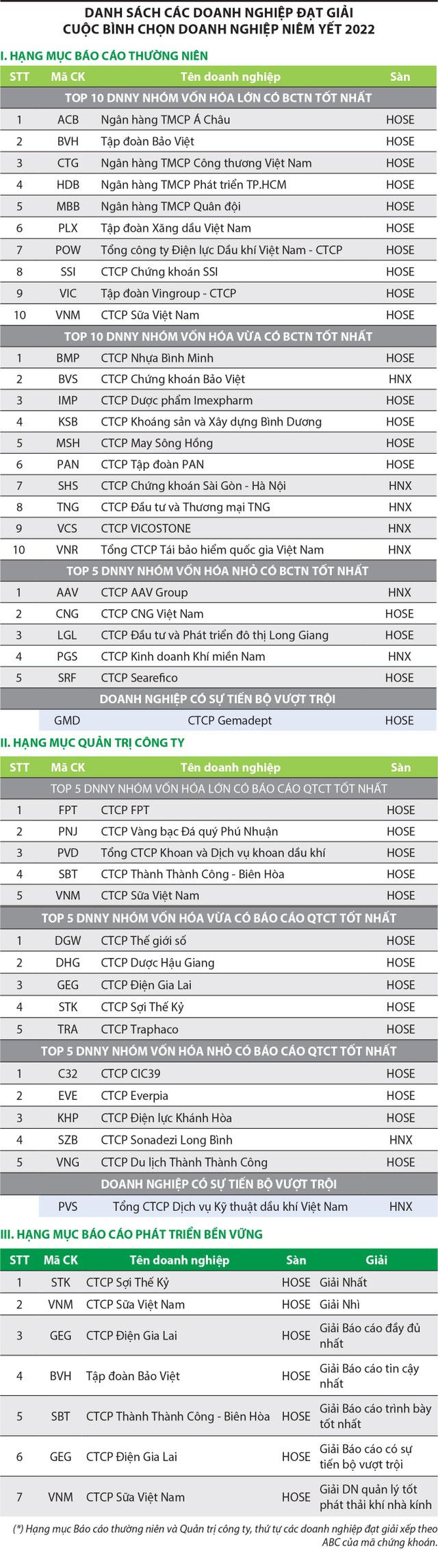 Bà Nguyễn Thị Việt Hà, Quyền Chủ tịch Công ty Sở Giao dịch chứng khoán TP.HCM cho hay, 2022 là năm thứ 15, HOSE phối hợp với Sở Giao dịch chứng khoán Hà Nội (HNX), Báo Đầu tư và Dragon Capital tổ chức Cuộc bình chọn Doanh nghiệp niêm yết, tiền thân là Cuộc bình chọn Báo cáo thường niên năm 2008, trở thành giải thưởng uy tín, vinh danh các doanh nghiệp niêm yết hàng đầu trên thị trường về báo cáo thường niên, quản trị công ty và phát triển bền vững.