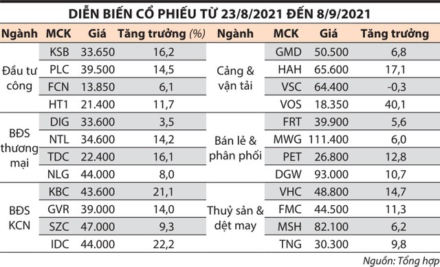 Trong đó, kể từ ngày 23/8-8/9, thị trường tiếp tục xu hướng tăng với dòng tiền tập trung chủ yếu vào nhóm cổ phiếu kỳ vọng hưởng lợi từ việc mở cửa nền kinh tế như đầu tư công; cảng và vận tải; bất động sản công nghiệp; bất động sản thương mại; bán lẻ; thuỷ sản và dệt may… Ngược lại, nhóm cổ phiếu trụ như chỉ số VN30 chỉ tăng nhẹ 1,5% lên 1.433,71 điểm.