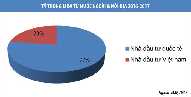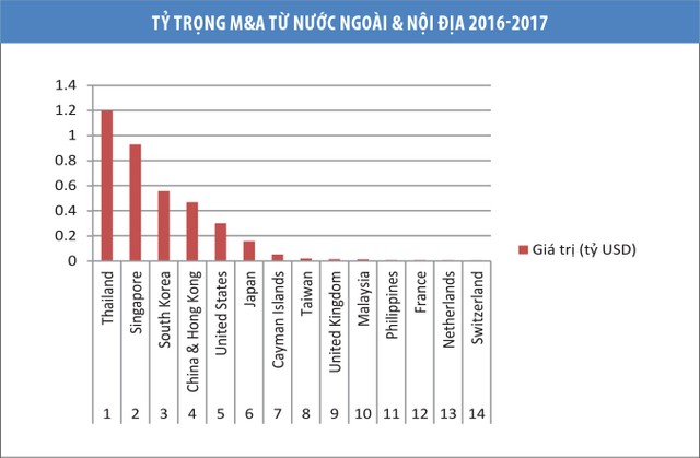 Thực tế thị trường M&A tại Việt Nam cho thấy, các thương vụ có nhà đầu tư ngoại chiếm 77% về tổng giá trị M&A, phần lớn đến từ Thái Lan, Singapore, Hàn Quốc và Nhật Bản. Trong đó, Thái Lan thường tập trung vào mảng bán lẻ và sản xuất; Nhật Bản đầu tư chiến lược vào các công ty hàng không, xăng dầu, dược phẩm; Singapore nổi lên với những thương vụ bất động sản thương mại; Hàn Quốc tập trung vào lĩnh vực thực phẩm và tài chính ngân hàng.