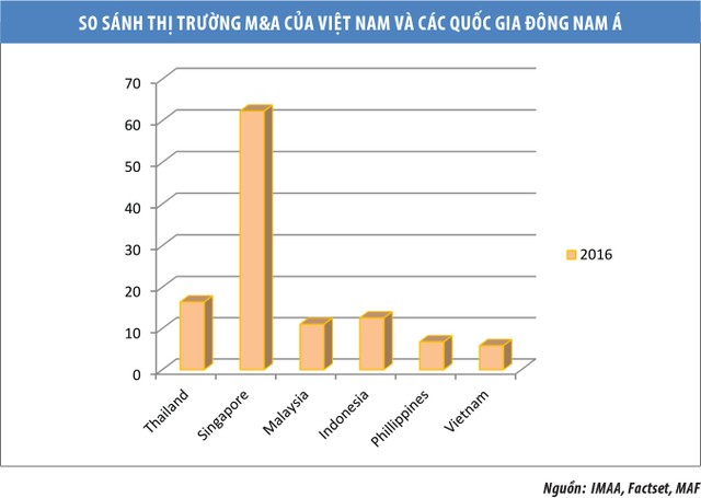 Theo thống kê của IMAA, tổng giá trị M&A tại Việt Nam năm 2016 đạt 5,8 tỷ USD, cao nhất từ trước đến nay và tăng trưởng 11,92% so với năm 2015. Tuy nhiên, chỉ bằng 86,22% so với thị trường Phillippines có tổng giá trị M&A 2016 đạt 6,75 tỷ USD và kém rất xa so với mức 62,3 tỷ USD của Singapore.