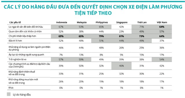 Lý do chính khiến người tiêu dùng lựa chọn mua xe điện xuất phát từ việc giảm chi phí vận hành (xăng, dầu...), vượt xa mối lo ngại về biến đổi khí hậu đối với tất cả các thị trường, ngoại trừ Việt Nam.
