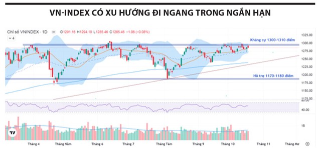 Về mặt kỹ thuật, VN-Index vẫn có khả năng giữ xu hướng đi ngang trong ngắn hạn, khi giới đầu tư thận trọng trước thời điểm báo cáo kết quả kinh doanh quý III sắp được các doanh nghiệp công bố. Theo đó, thị trường ít có khả năng biến động mạnh và chỉ số chung cần thêm động lực để phá vỡ ngưỡng kháng cự hiện tại, với các nhóm ngành chưa nhận được sự quan tâm của dòng tiền cần thêm thời gian tích lũy để tham gia vào xu hướng tăng. Dự báo, VN-Index sẽ đi ngang tích lũy trong vùng 1.270 - 1.300 điểm.