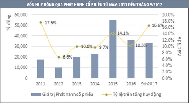 Sự tích cực của TTCK đã tạo điều kiện cho nhiều doanh nghiệp gọi vốn thành công. Số liệu từ Ủy ban Chứng khoán Nhà nước cho thấy, trong 9 tháng đầu năm 2017, tổng mức huy động thông qua phát hành cổ phiếu đạt 33.500 tỷ đồng, bằng 93% mức thực hiện trong cả năm 2016.
