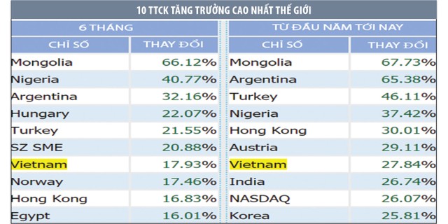 Tính đến ngày 10/11, VN-Index đạt mức 868 điểm, tăng 29,5% so với cuối 2016, đạt mức cao nhất từ tháng 2/2008 đến nay. HNX-Index vượt mốc 100 điểm, tăng 35% so với đầu năm. Điểm số của TTCK Việt Nam lọt Top tăng trưởng hàng đầu thế giới, vượt qua các chỉ số chứng khoán tên tuổi như Nikkei 225 (19,68%), Dow Jones (19,2%), S&P 500 (15,71%), FTSE 100 (5,18%) (xem bảng).