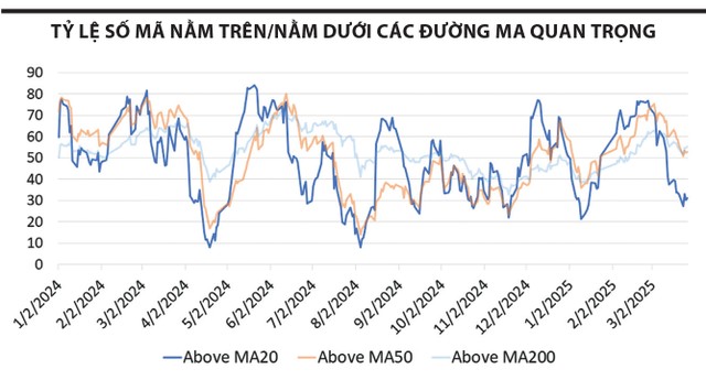 Thống kê về tỷ lệ các mã nằm trên/nằm dưới các đường MA20, MA50, MA200 cho thấy một dấu hiệu đáng lưu ý: Thị trường đang có cấu trúc yếu, bất chấp việc chỉ số neo ở vùng cao.