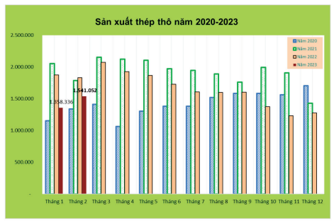 Tính chung 2 tháng đầu năm, sản xuất thép thô đạt 2,899 triệu tấn, giảm 22% so với cùng kỳ năm 2022. Tiêu thụ đạt 3,118 triệu tấn, giảm 10%. Xuất khẩu thép thô đạt 13% so với cùng kỳ năm 2022 với sản lượng xuất khẩu là 312.000 tấn.