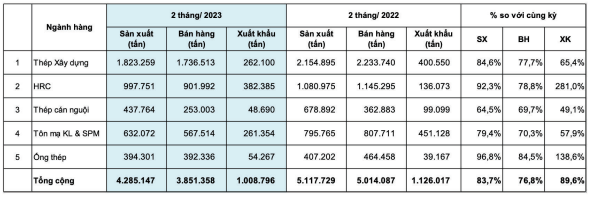 Tính chung 2 tháng đầu năm, sản xuất thép thành phẩm đạt 4,285 triệu tấn, giảm 16,3% so với cùng kỳ năm 2022. Bán hàng đạt 3,851 triệu tấn, giảm 23,2% so với cùng kỳ năm 2022; trong đó, xuất khẩu đạt 1 triệu tấn.
