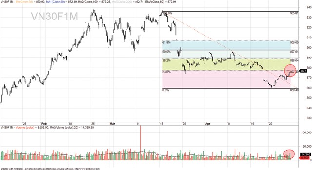 Kịch bản mua sẽ được kích hoạt trong 2 trường hợp. Trường hợp 1, giá bứt qua cửa sóng với vùng kháng cự 880 - 885 điểm trên chỉ số phái sinh, nhất là khi kèm theo thanh khoản bùng nổ. Trường hợp hai, chỉ số quay lại tiếp cận vùng đáy cũ là ngưỡng hỗ trợ 860 điểm.