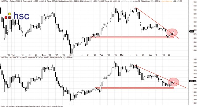 Lẽ dĩ nhiên, một vùng nhạy cảm như vậy sẽ chứng kiến sự giằng co quyết liệt giữa người mua - người bán. Do vậy, việc áp đặt tư duy cho thị trường ở giai đoạn này là rất khó và cũng không nhất thiết phải như thế, vì 2 kịch bản mua và bán trên sàn phái sinh đều có xác suất 50/50.