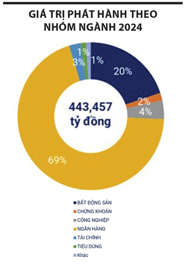 Một là, sự dẫn dắt của nhóm ngân hàng. Các ngân hàng chiếm 69% tổng giá trị phát hành trái phiếu doanh nghiệp năm 2024, dự kiến sẽ duy trì tỷ trọng này để củng cố nguồn vốn trung và dài hạn, đáp ứng nhu cầu tăng trưởng tín dụng mục tiêu là 16% trong năm 2025. Nhu cầu tín dụng này chủ yếu đến từ các lĩnh vực như bán lẻ, cho vay tiêu dùng và giải ngân các dự án lớn trong lĩnh vực hạ tầng. Theo đó, các ngân hàng cần phát hành trái phiếu để tuân thủ các quy định về tỷ lệ an toàn vốn theo yêu cầu của Ngân hàng Nhà nước.