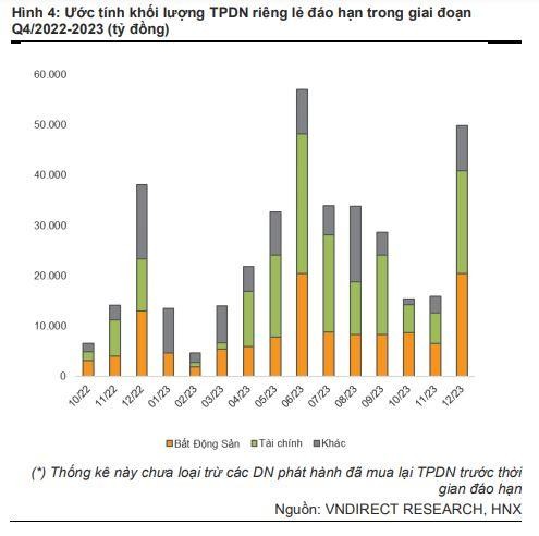 Tổng giá trị TPDN riêng lẻ đáo hạn trong quý IV/2022 đạt mức 58.840 tỷ đồng (-9,1% so với quý trước; +87,7% so với cùng kỳ). Trong đó, tỷ lệ TPDN đáo hạn của ngành bất động sản, tài chính - ngân hàng, khác lần lượt là 34,1%, 32,9% và 33,0%. VNDirect cho biết, thống kê của đơn vị này chỉ bao gồm các đợt phát hành TPDN riêng lẻ từ năm 2019 tới nay và không bao gồm các doanh nghiệp phát hành đã thực hiện mua lại trái phiếu trước thời gian đáo hạn.