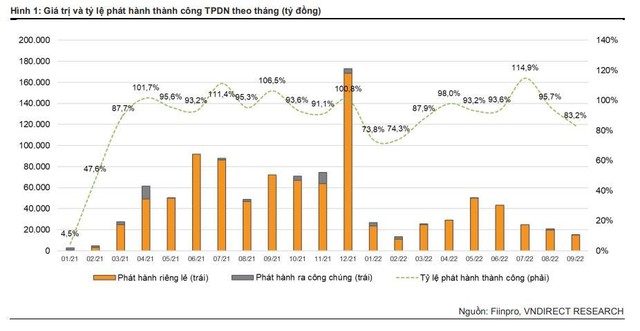 Theo VNDirect, ngay từ thời điểm tháng 3/2022, thị trường TPDN chậm lại nhằm chờ đợi Nghị định sửa đổi Nghị định 153/NĐ-CP/2020, với mục tiêu bảo vệ quyền lợi hợp pháp của nhà đầu tư cũng như nâng cao chất lượng của thị trường vốn. Trong bối cảnh đó, tổng giá trị phát hành TPDN trong 9 tháng 2022 giảm mạnh 43,5% so với cùng kỳ xuống còn 248.603 tỷ đồng; trong đó, 240.804 tỷ đồng phát hành riêng lẻ (-42,2% so với cùng kỳ) và 7.799 tỷ đồng phát hành ra công chúng (-66,8% so với cùng kỳ).
