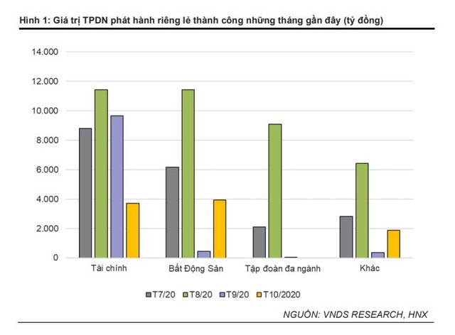 Lũy kế 10 tháng, nhóm tài chính - ngân hàng tiếp tục dẫn đầu với giá trị phát hành thành công là 83.501 tỷ đồng, chiếm tỷ trọng 25,6% tổng giá trị phát hành riêng lẻ. Đứng thứ 2 là nhóm ngành bất động sản với giá trị phát hành đạt 63.155 tỷ đồng, chiếm tỷ trọng 19,4% tổng giá trị phát hành. Nhóm tập đoàn đa ngành có giá trị phát hành đạt mức 21.111 tỷ đồng, chiếm tỷ trọng 6,5%. Các ngành còn lại đạt mức 158.258 tỷ đồng, chiếm tỷ trọng 48,5%.