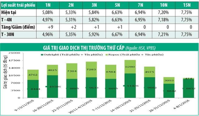 Từ 4-8/1, 16.129 tỷ đồng reverse repo được giao dịch và 3.859 tỷ đồng reverse repo đáo hạn. Ngân hàng Nhà nước (NHNN) không phát hành thêm tín phiếu để hỗ trợ cho thanh khoản của hệ thống ngân hàng.