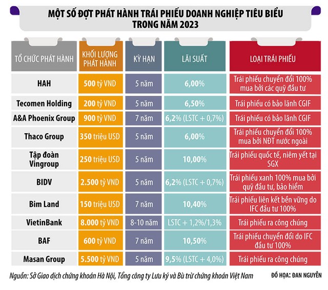 Một số giao dịch lớn đáng ghi nhận trong năm 2023 đến từ đợt phát hành 8.680 tỷ đồng của Thaco, hay Công ty Khai thác chế biến khoáng sản Núi Pháo (thuộc Tập đoàn Masan) trị giá 3.600 tỷ đồng. Tính đến cuối năm 2023, quy mô thị trường trái phiếu doanh nghiệp đạt 11,8% GDP và chiếm 9,4% tổng dư nợ tín dụng của cả nền kinh tế.