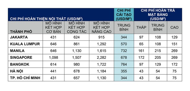 Với mức chi phí trung bình 678 USD/m² tại Hà Nội và 657 USD/m² tại TP.HCM, cả hai thị trường đều nằm trong nhóm các thành phố có chi phí hoàn thiện nội thất văn phòng thấp hơn trong khu vực.