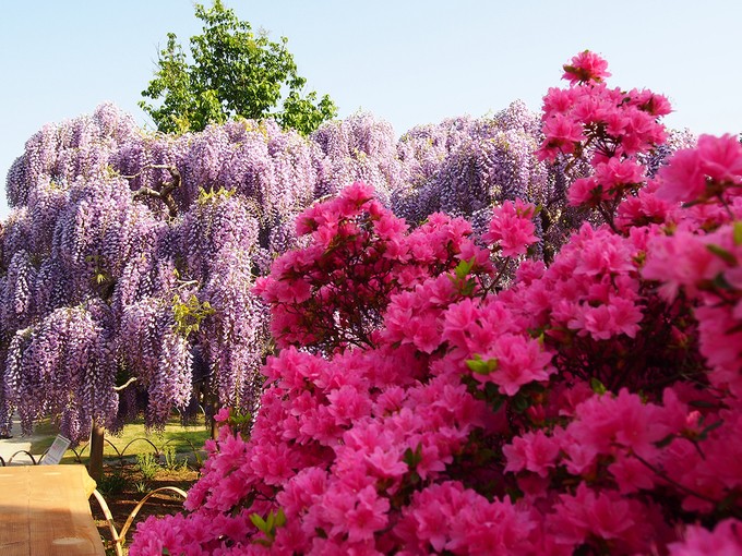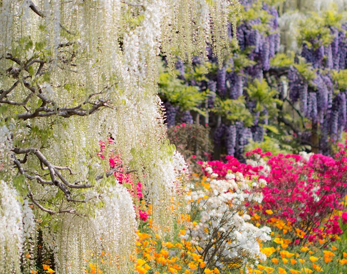 Các loài hoa khoe sắc trong hoa viên Ashikaga. Hoa viên này mở cửa đón du khách từ 7h đến 21h (khung giờ vào mùa hoa tử đằng nở rộ tới 12/5). Những ngày sau đó, nơi đây mở cửa đến 18h. Giá vé cho người lớn là 8-16 USD, còn vé trẻ em 4-8 USD.