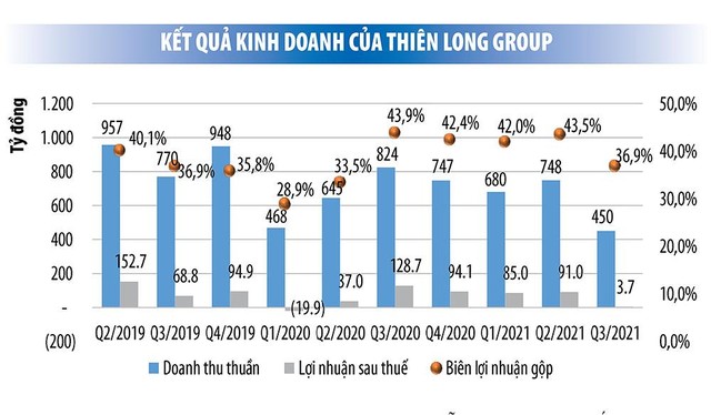 Sức ép lên biên lợi nhuận càng lớn trong bối cảnh doanh thu thấp do tình trạng đóng cửa trường học, văn phòng, công sở kéo dài cũng ảnh hưởng đến khả năng chuyển đà tăng giá nguyên vật liệu vào giá bán. Những tác động này khiến biên lợi nhuận gộp của Thiên Long Group trong quý III/2021 giảm 6,63 điểm phần trăm so với quý II, đạt 36,9%.
