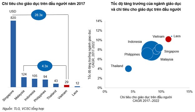 Tính riêng mảng giáo dục, tiềm năng từ thị trường này của TLG vẫn còn lớn khi chi tiêu cho giáo dục trên đầu người của Việt Nam chỉ đạt 29 USD/đầu người, rất thấp so với mức trung bình 175 USD/đầu người của khu vực Đông Nam Á. Theo ước tính, tốc độ tăng trưởng chi tiêu cho giáo dục trên đầu người của Việt Nam có thể đạt 12%/năm giai đoạn 2017 – 2022.
