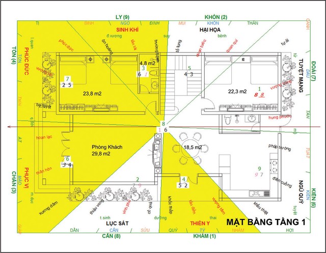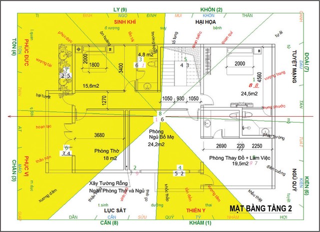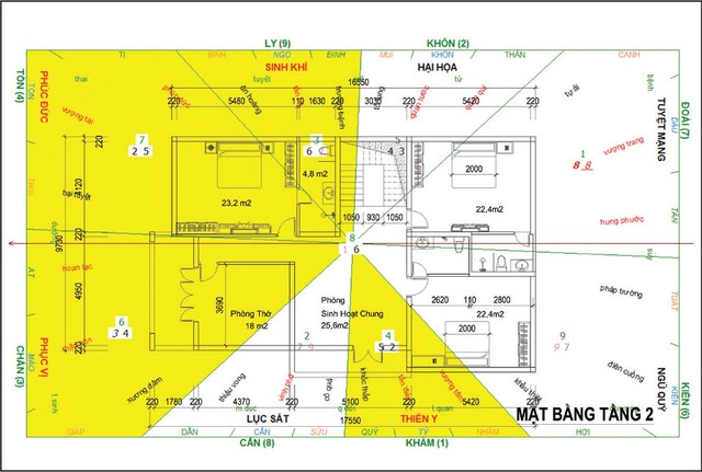 Tiếp đến là thiết kế kiến trúc mặt bằng tầng 2 và áp theo phong thủy, để rồi luận phong thủy tổng quan xem sự hợp lý giữa kiến trúc và phong thủy ra sao.