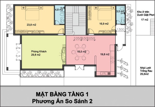 Ở phương án này, cầu thang đi lên thuận chiều kim đồng hồ, vệ sinh khép kín phục vụ phòng ông/bà có diện tích đủ rộng, không gian ăn và bếp đã hợp lý và tiện dụng. Khách đến chơi và ở lại ăn cơm sẽ thuận tiện khi đi vệ sinh.