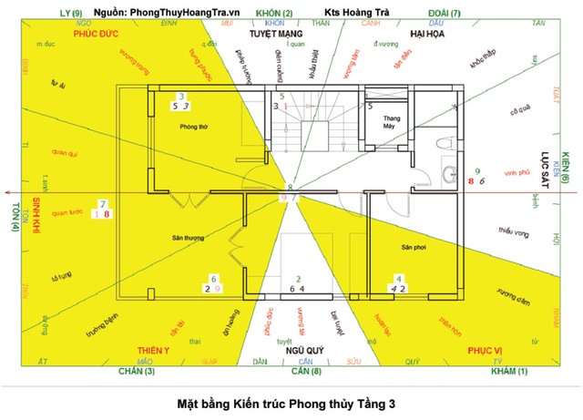 Sau khi các phương án kiến trúc của các tầng dưới được thống nhất, thì việc thiết kế và đặt phong thủy cho tầng 3 rất đơn giản (xem hình 4), bởi tầng 3 chỉ có phòng thờ là không gian quan trọng nhất. Có một phòng ngủ thì đặt vị trí tốt theo phong thủy không khó khăn gì.