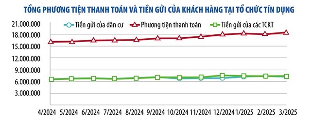 Số liệu mới nhất vừa được Ngân hàng Nhà nước công bố cho thấy, đến cuối tháng 3/2025, tiền gửi cả khách hàng cá nhân và tổ chức kinh tế của các tổ chức tín dụng đạt gần 15 triệu tỷ đồng, tăng 1,8% so với tháng liền trước. Trong đó, tiền gửi của dân cư đạt 7,47 triệu tỷ đồng, tăng 5,73% so với đầu năm. Tiền gửi của doanh nghiệp đạt 7,52 triệu tỷ đồng, giảm 1,92% so với cuối năm 2024, nhưng tăng hơn 158.000 tỷ đồng so với tháng trước.
