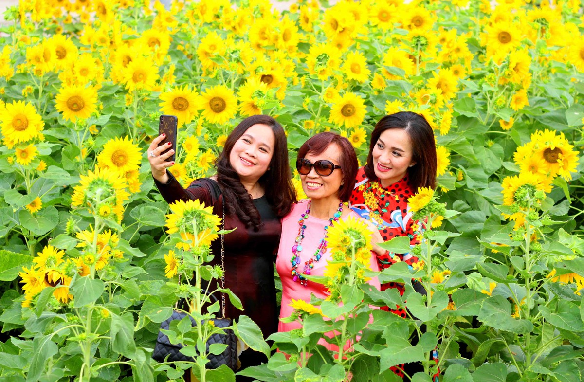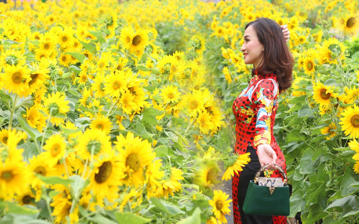 Kelly, cô gái việt kiều Mỹ tạo dáng ở vườn hoa hướng dương, khu Phú Mỹ Hưng. Năm nào về Việt Nam cô cũng diện áo dài để du xuân.