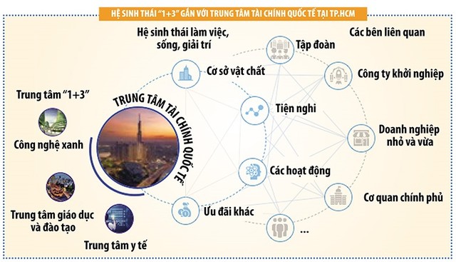 Trung tâm tài chính quốc tế tại TP.HCM sẽ phát triển theo mô hình “1+3”, với lõi là trung tâm tài chính quốc tế và 3 trung tâm công nghiệp xanh, chăm sóc sức khỏe và giáo dục và đào tạo nhằm tạo nên hệ sinh thái tài chính toàn diện. Mô hình này sẽ tập trung phát triển các sản phẩm tài chính cốt lõi, bao gồm thị trường tiền tệ và hệ thống ngân hàng, thị trường cổ phiếu, trái phiếu doanh nghiệp và thị trường hàng hóa.