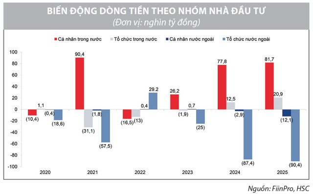 Từ đầu năm tới nay, khối ngoại đã bán ròng hơn 100.000 tỷ đồng - mức cao nhất nhiều năm, vượt cả năm trước. Ngược lại, dòng tiền trong nước duy trì sự thận trọng trong ngắn hạn nhưng chưa rơi vào trạng thái bi quan: nhà đầu tư nội không đẩy mạnh mua vào, song cũng không ồ ạt bán ra theo khối ngoại. Diễn biến này nhiều khả năng phản ánh hoạt động chốt lời sau mức tăng hơn 30% của chỉ số kể từ đầu năm.