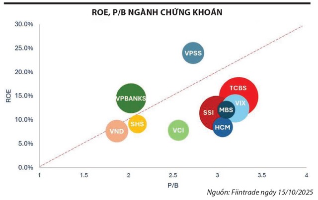 Ngoài ra, lợi nhuận sau thuế 9 tháng đầu năm 2025 của VPS đạt hơn 2.564 tỷ đồng, vượt cả lợi nhuận sau thuế năm 2024 và tăng 52,3% so với cùng kỳ. Điểm khác biệt của VPS là không tham gia tự doanh, với 70% doanh thu đến từ môi giới và cho vay ký quỹ (margin). Điều này giúp VPS duy trì lợi nhuận và tỷ suất sinh lời cao, với ROE ở mức 24,4% và ROA đạt 8,7% (số liệu 12 tháng đến tháng 9/2025) - cao nhất ngành.