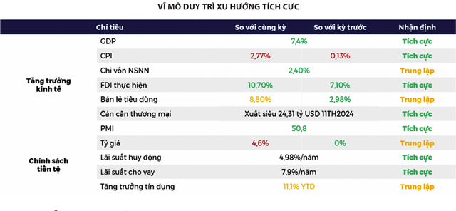 Tháng 11/2024, kinh tế Việt Nam duy trì đà phục hồi mạnh mẽ, với nhiều điểm sáng tích cực. Lạm phát tăng nhẹ 2,77% so với cùng kỳ năm trước, chủ yếu do giá nhà ở và điện tăng, nhưng vẫn nằm trong kiểm soát, tạo dư địa cho tháng cuối năm.